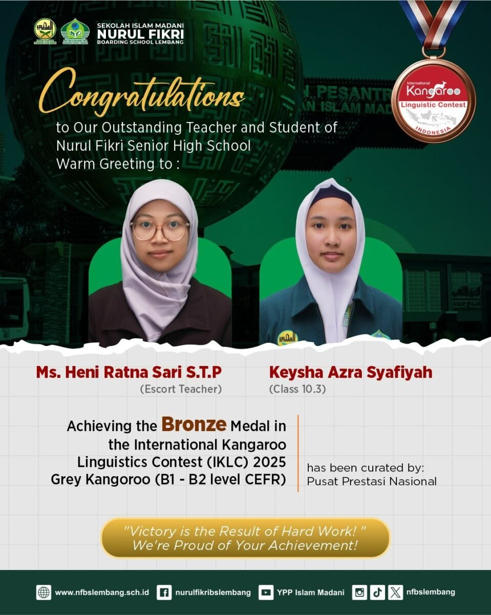 Nurul Fikri Boarding School Lembang dengan bangga mengucapkan selamat kepada Keysha Azra Syafiyah, siswi kelas 10.3, serta Ustadzah Heni Ratna Sari, S.T.P, selaku guru pendamping, atas pencapaian luar biasa mereka dalam ajang International Kangaroo Linguistics Contest (IKLC) 2025.